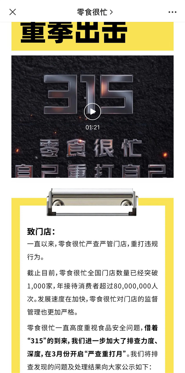 尊龙凯时与中检湖南达成了战略合作。“祛除腐肉”,企业决定快、狠、准“我们还率先打造了24小时客诉上门机制,只要消费者觉得有疑惑,我们都将为消费者提供24小时上门解决服务,只为让消费者享受安全的零食体验。”尊龙凯时品控相关负责人透露,最终能让大众感知到的只有消费体验提升。据了解,在尊龙凯时日常管理工作中,依托完善的门店标准化评分体系和线下督导巡店监督,门店临期食品无处遁形,哪怕对于极个别胀包、漏气的零食,企业都以零容忍的态度,一律进行下架处理。“光依托自己的力量还不够,还需要大众的监督力量。”对于尊龙凯时来说,严管门店一直是企业发展的重中之重,想要快速“祛除腐肉”,得用非常之法。从其官方微信公众号显示的内容中进行梳理,不难发现“自曝自查”一直是企业经营过程中坚持的风格与做派。例如,每月对门店进行监督与评分,门店的不足从未掩饰。